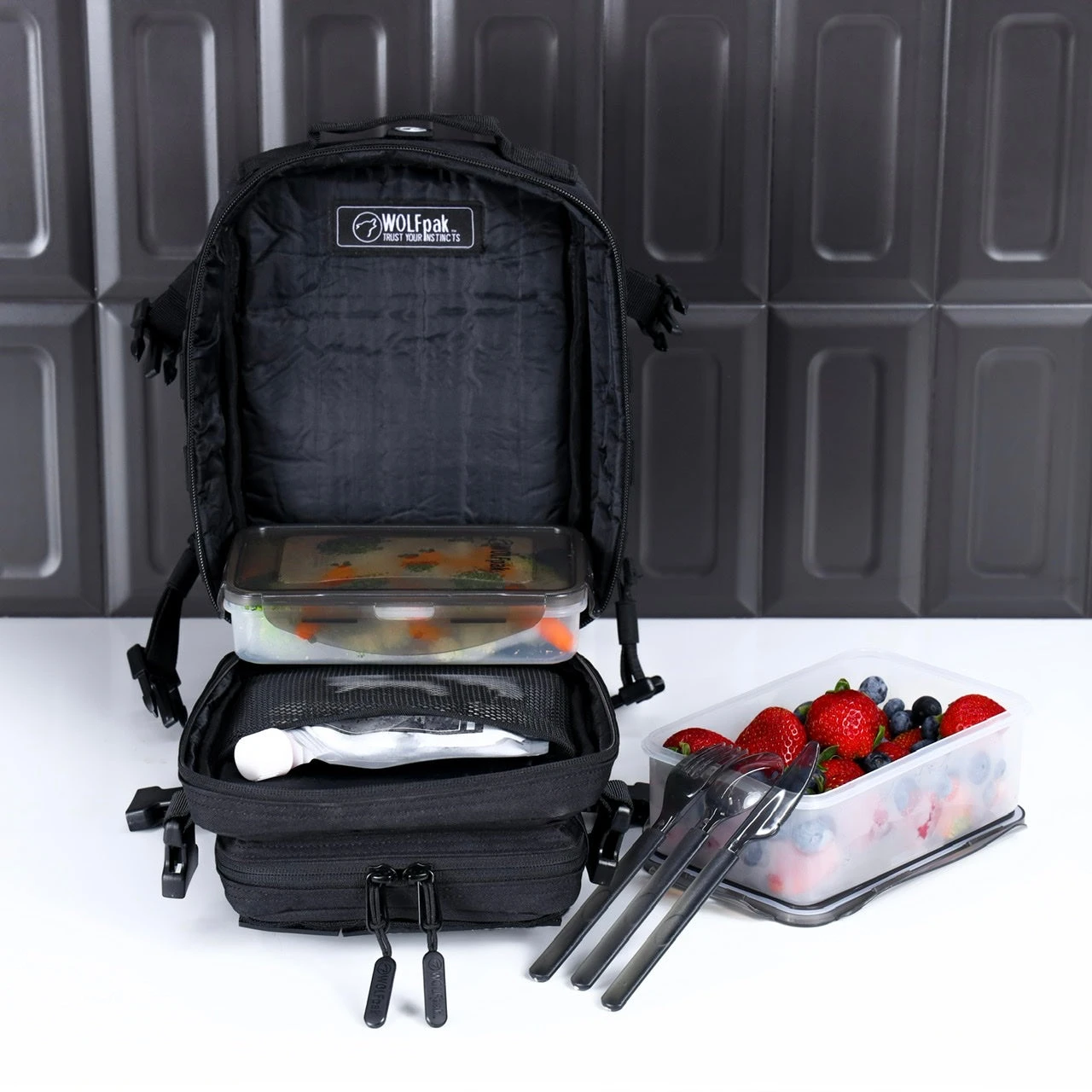 Keeping to the aesthetics of our WOLFpak we re-engineered the inner functionality to now hold your meals with a cooler department! Changing the game in Meal Management Backpacks!