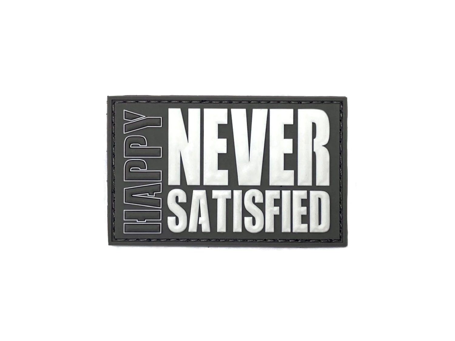 Happy Never Satisfied rubber 3D velcro patch in gray and white