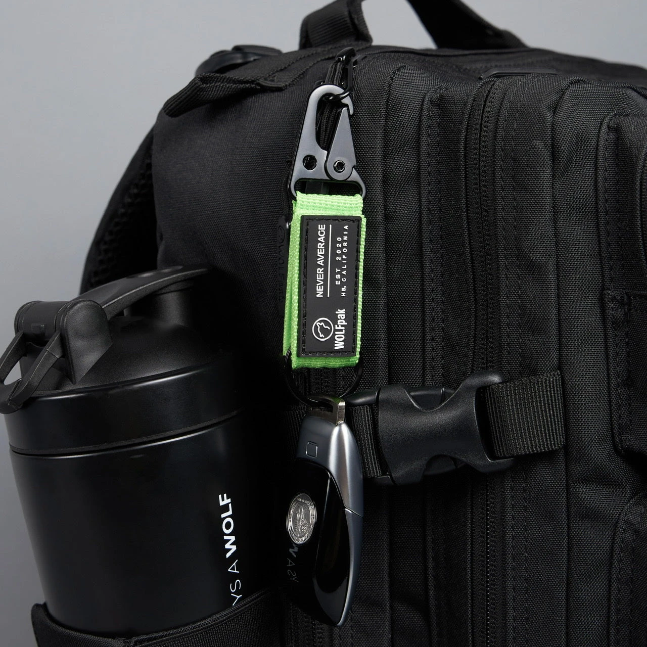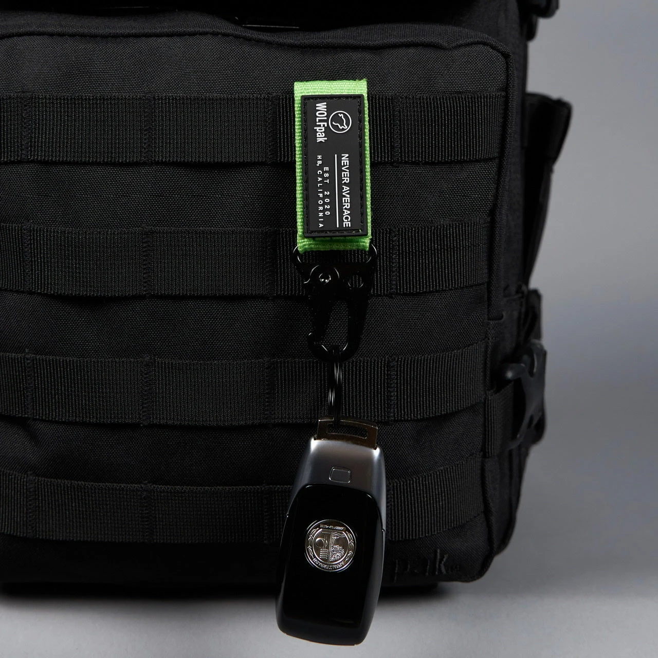 The nylon portion includes WOLFpak est. 2020 Logo Patch branding on one side and hook/loop strip for additional patches on the opposite side with a convenient fold over to attach to your Molle area of the WOLFpak, Waist Belt or End of the Zipper holding your keys or use as a Zipper Pull.Â