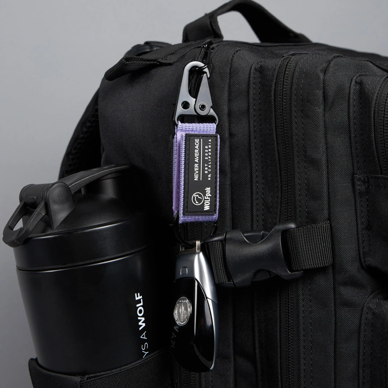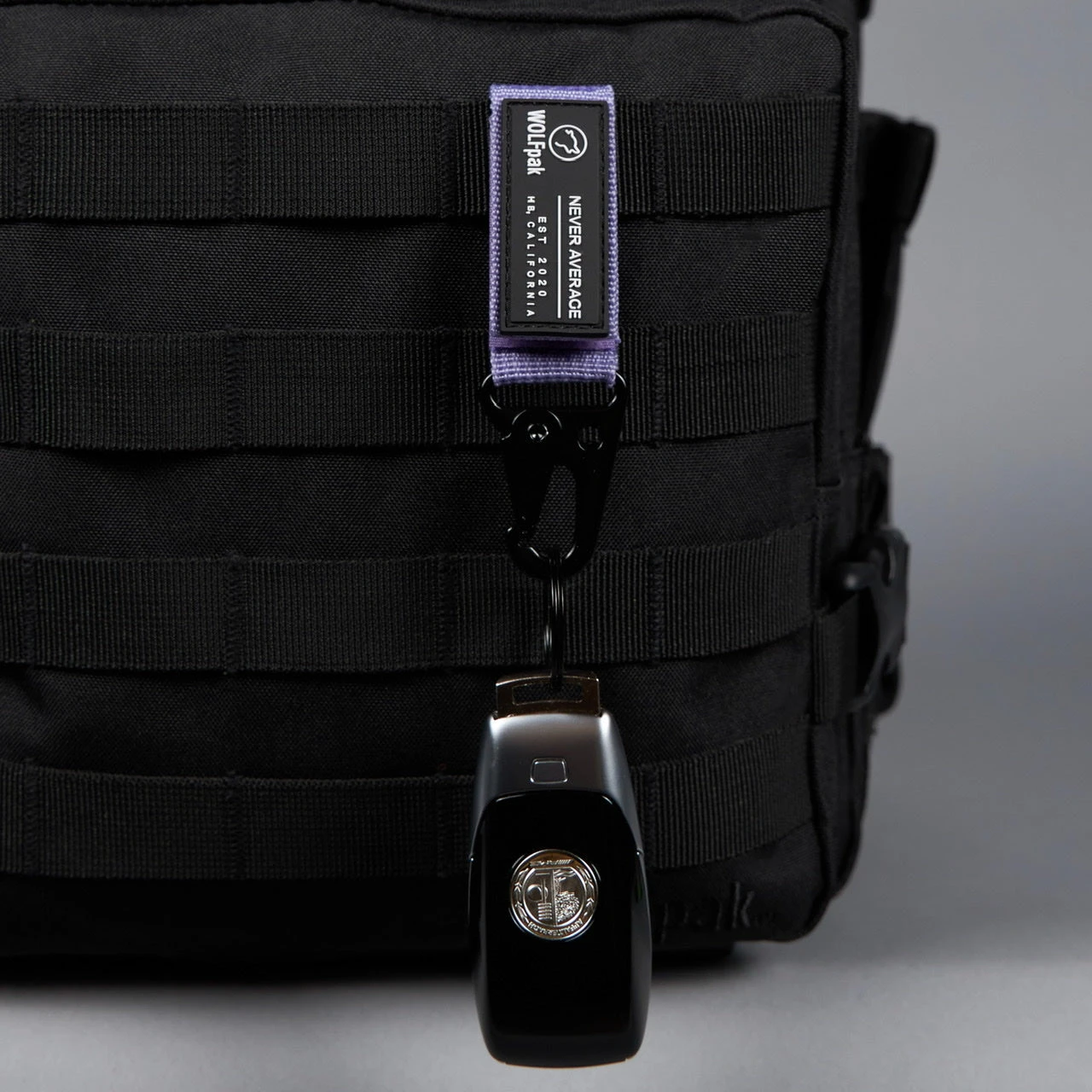 The nylon portion includes WOLFpak est. 2020 Logo Patch branding on one side and hook/loop strip for additional patches on the opposite side with a convenient fold over to attach to your Molle area of the WOLFpak, Waist Belt or End of the Zipper holding your keys or use as a Zipper Pull.
