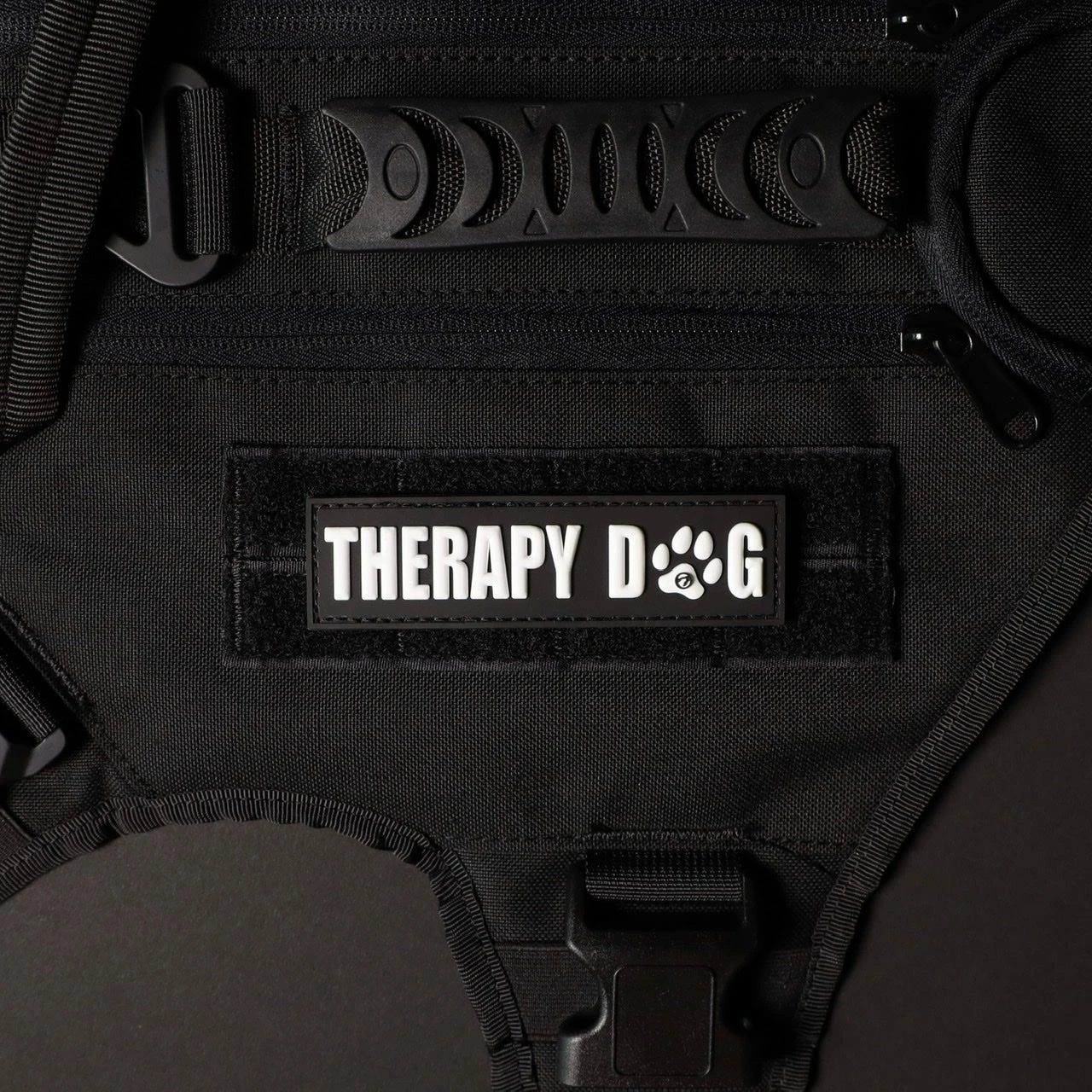 Therapy dog stitched velcro patch with black background and white writing.