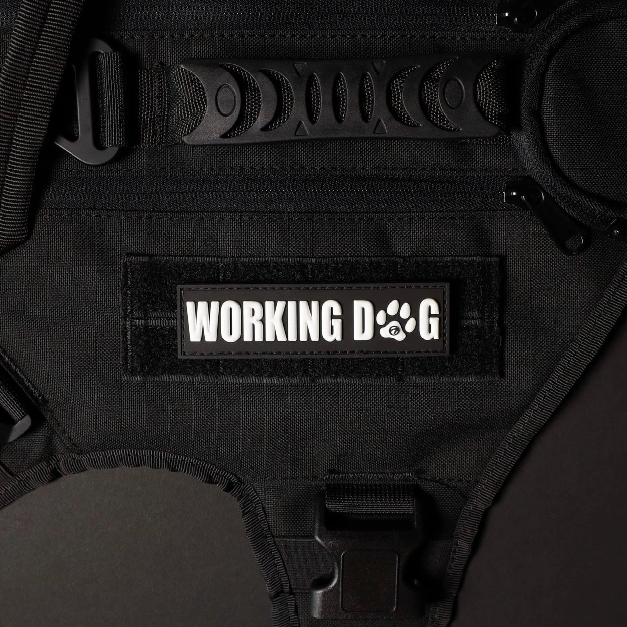 Working dog stitched velcro patch with black background and white writing.
